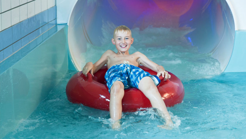 Hjortensbergsbadet. 94 meter lång rutschkana.
